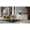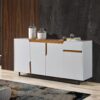 Aparador Fiori 4 portas lacado branco névoa e carvalho, com pés em ferro preto.. Apresenta uma gaveta C/ faqueiro e prateleiras no seu interior.