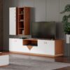 Base TV Boomerang em cerejeira com lacado branco. Disponível também em carvalho cinza com lacado branco.