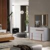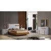 Quarto Fiori composto por cama, duas mesas de cabeceira, cómoda e moldura com acabamento lacado branco névoa e carvalho na cor mel. Colchão e estrado não incluídos. Composto por cinco peças.